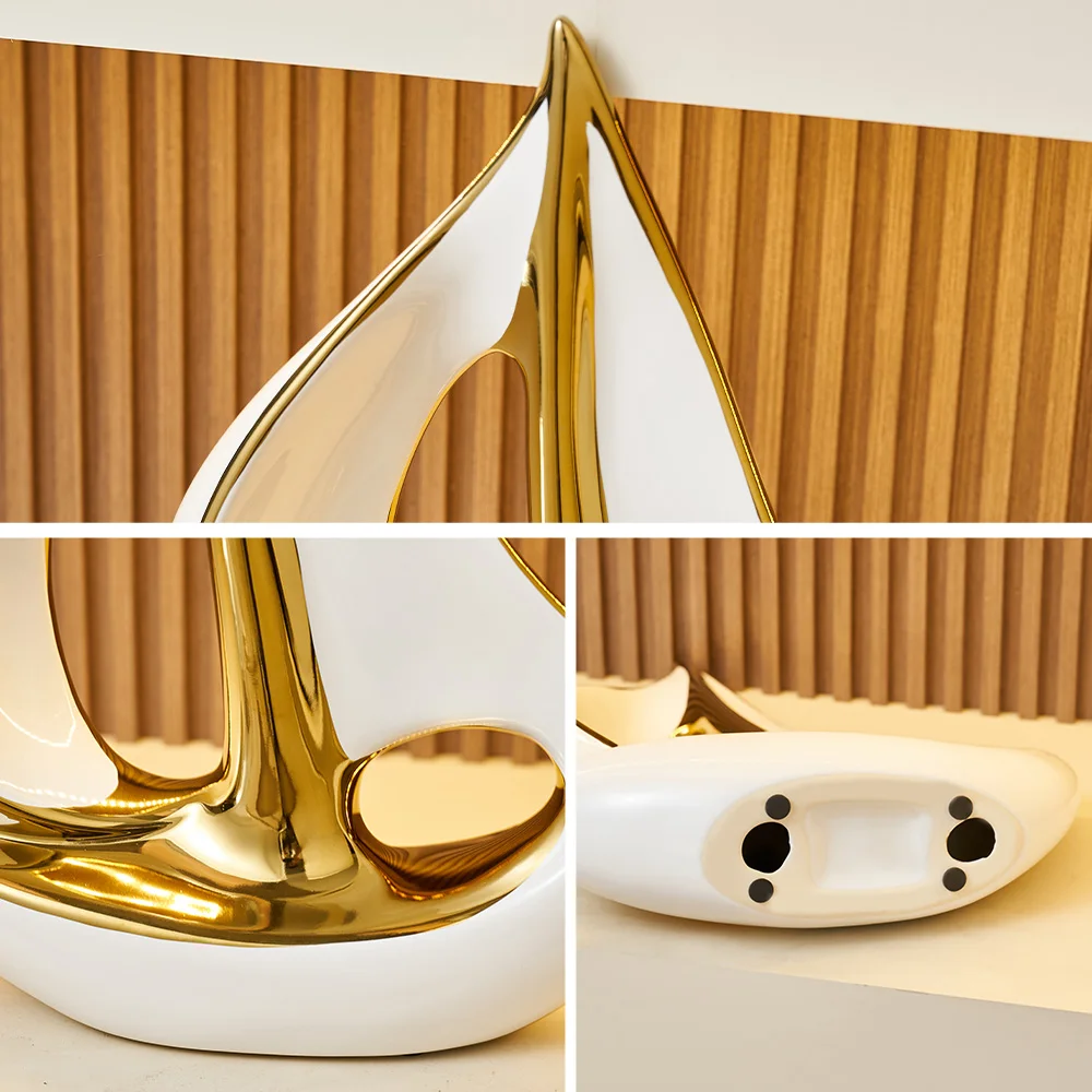 Cette statue contemporaine de voilier est un objet de grande qualité en émail et céramique juste superbe! Ses lignes épurées stylisées pour un rendu très moderne sont rehaussées par ses couleurs : le blanc pour la coque et les voiles et le doré qui vient souligner harmonieusement les contours et le pont.