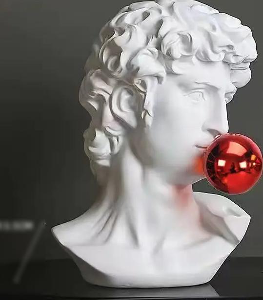 L'utilisation du chewing-gum, un objet du quotidien, comme élément artistique, sortant de la bouche de ce buste d'homme grec, souligne l'effet contemporain dans le classique. La couleur vive et provocante de la bulle rouge crée un effet de surprise que l'on adore, exactement dans l'air du temps de la mode de l'art aujourd'hui.