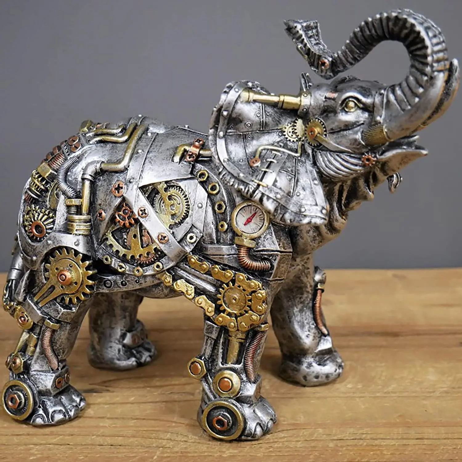 Cette statue industrielle éléphant est faite en résine, superbement réalisée pour donner l’impression qu’elle est composée d’engrenages et de pièces de métal. Une représentation à la fois moderne et vintage qui saura trouver sa place dans n’importe quel style de décoration.