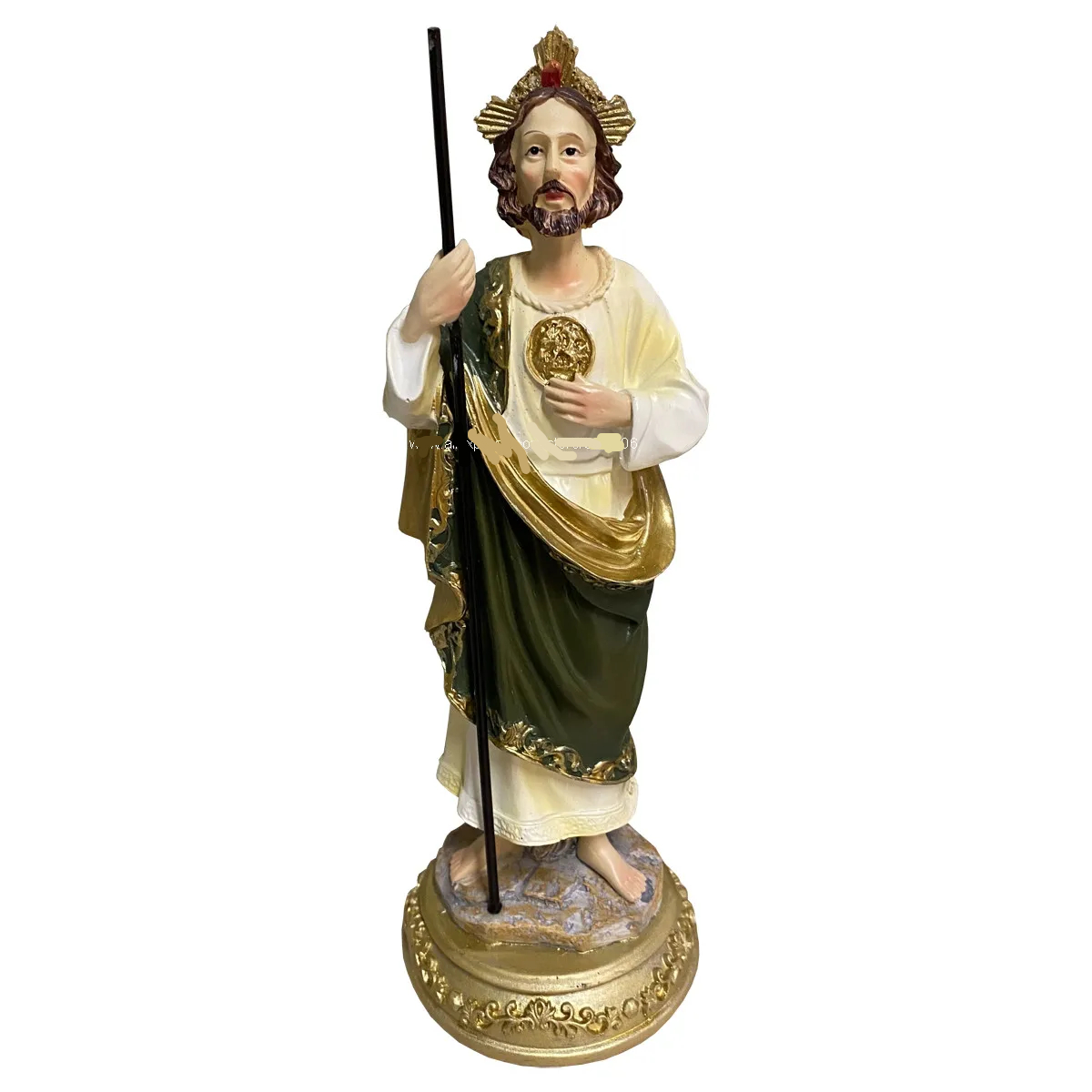 Cette statue de Saint Joseph avec son bâton est fabriquée en résine de qualité ce qui lui permettra de rester intacte longtemps puisqu'elle est résistante au temps et aux rayons UV ainsi que la peinture dont elle est recouverte. Cette dernière est brillante et apporte un côté assez original à Saint Joseph d'habitude plus humble : sa couronne est dorée ainsi que le gros médaillon sur la poitrine, et son habit vert est ourlé de dorure