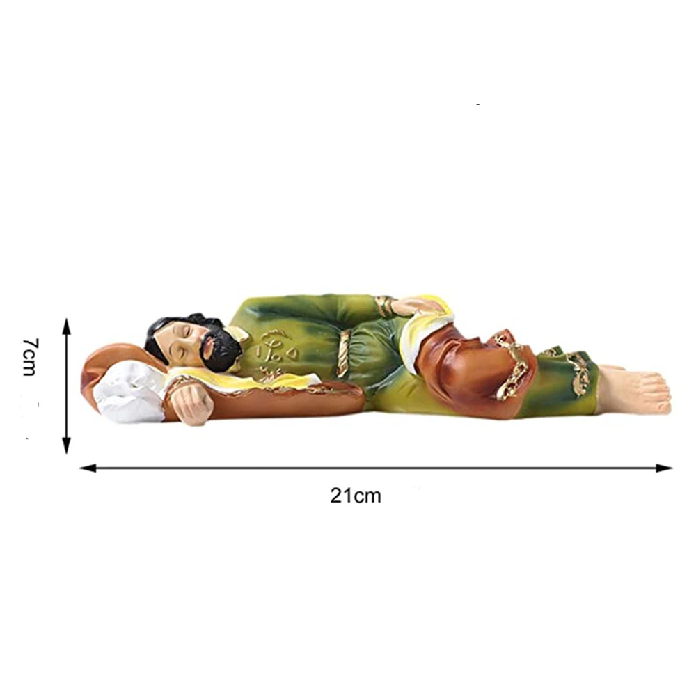 Cette statue de Saint Joseph endormi est fabriquée dans une résine de grande qualité qui vous gardera cet objet intact pendant de nombreuses années ainsi que sa couleur : résistante à l'usure et aux rayons UV, elle vous promet une grande longévité. Sa robe verte et son manteau marron foncé sont souvent les attributs qui le représentent, ici aussi rehaussés de dorures