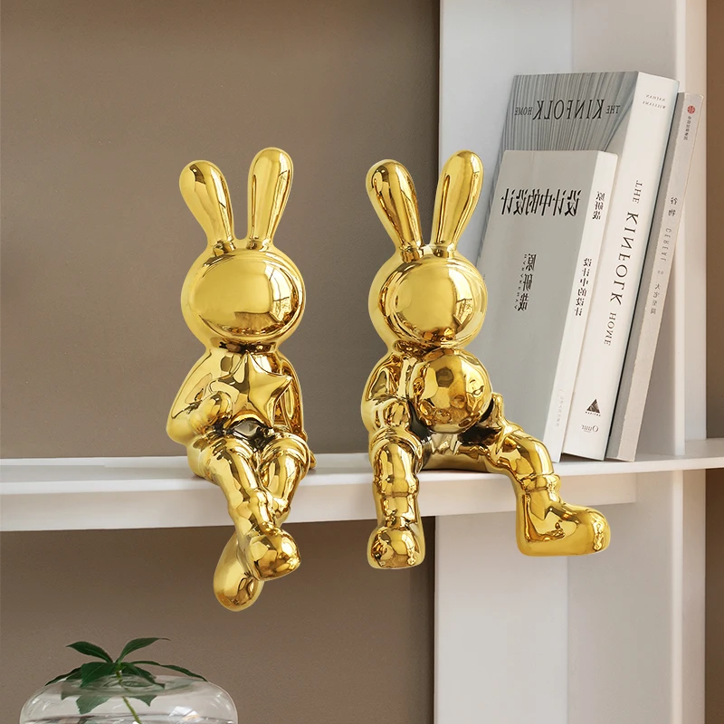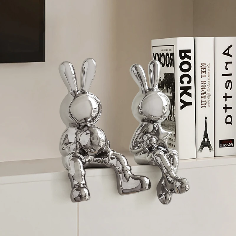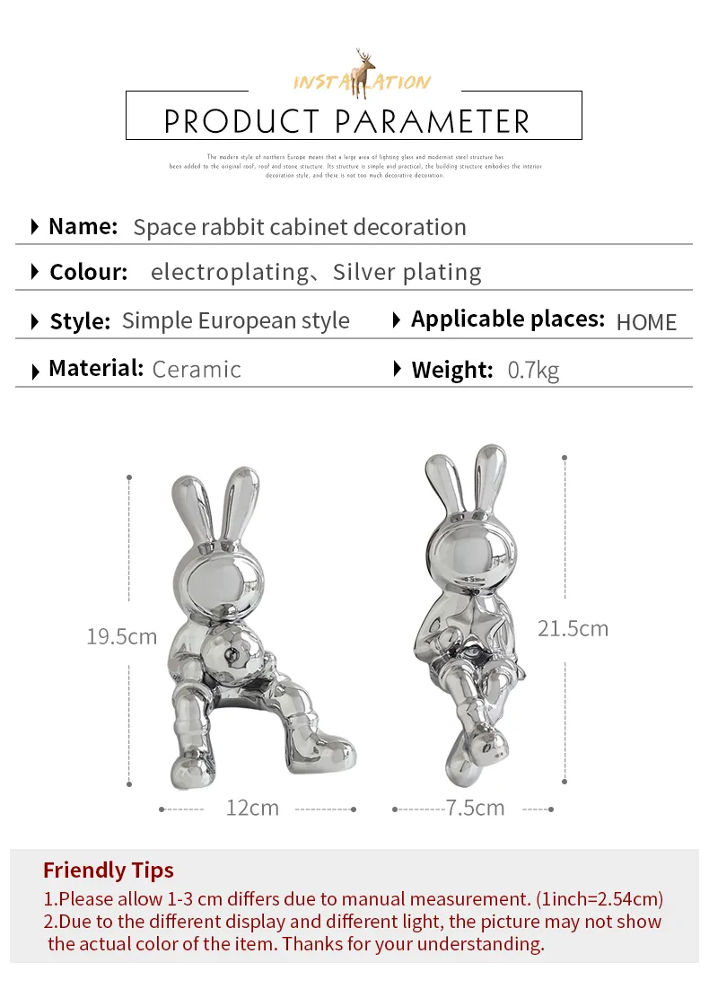 Nos statues de lapins sont en position assise, l'un deux a les jambes écartées et tient une sphère entre ses pattes, l'autre à les jambes croisées et tient une étoile devant lui. Ses lapin modernes semble être habillés comme des cosmonaute avec un casque scaphandre sur la tête. Une oeuvre d'art à l'esthétique moderne et urbaine qui changera votre intérieur.