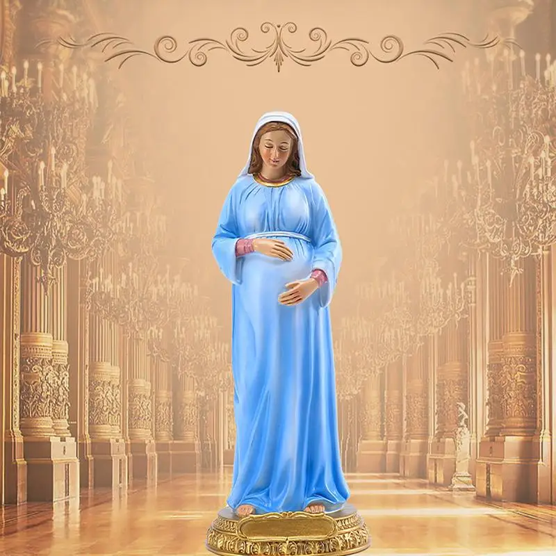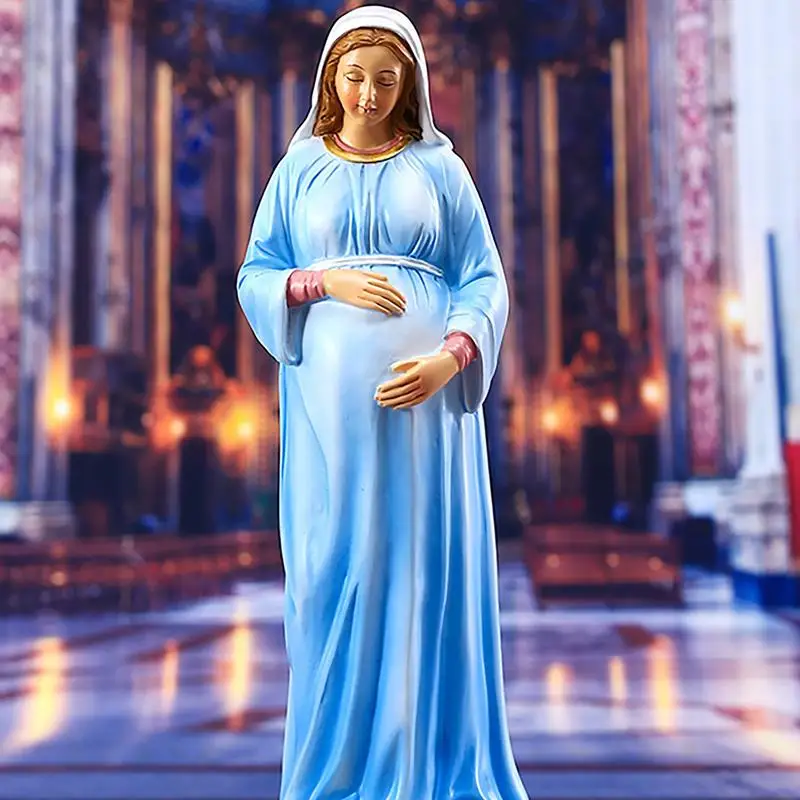 Son regard est tourné vers le sol, exprimant une profonde humilité et une connexion divine. Cette posture symbolise à la fois la joie de la maternité imminente et la confiance en Dieu qui accompagne cette étape importante de sa vie. La statue de la Vierge Marie enceinte est un rappel puissant de la force et de la grâce féminines, ainsi que de la bénédiction de la maternité.